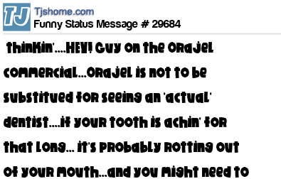 X thinkin'....HEY! Guy on the Orajel commercial...Orajel is not to be substitued for seeing an 'actual' dentist....if your tooth is achin' for that long... it's probably rotting out of your mouth...and you might need to get that checked out....