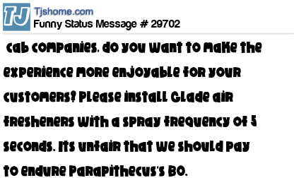 X is cab companies, do you want to make the experience more enjoyable for your customers? Please install Glade air fresheners with a spray frequency of 5 seconds. Its unfair that we should pay to endure Parapithecus's BO.