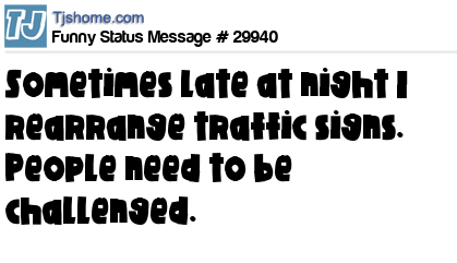 - # 53587 Sometimes? Late at night? I rearrange traffic signs. People need to be challenged.
