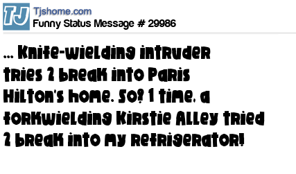X says ... Knife-wielding intruder tries 2 break into Paris Hilton's home. So? 1 time, a forkwielding Kirstie Alley tried 2 break into my refrigerator!