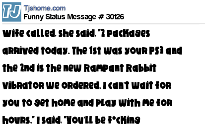 X Wife called, she said, "2 packages arrived today. The 1st was your PS3 and the 2nd is the new Rampant Rabbit vibrator we ordered. I can't wait for you to get home and play with me for hours." I said, "You'll be f*cking lucky, I only ordered 1 controller.