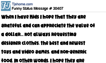 X When I have kids I hope that they are grateful and can appreciate the value of a dollar... not always requesting designer clothes, the best and newest toys and video games, and non-generic food. In other words, I hope they are nothing like me.
