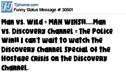 X Man vs. Wild = MAN WINS!!.....Man vs. Discovery Channel = The Police Win!! I can't wait to watch the Discovery Channel Special of the Hostage Crisis on the Discovery Channel.
