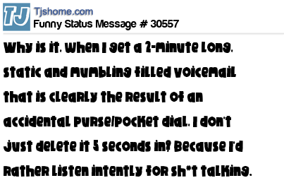 X Why is it, when I get a 2-minute long, static and mumbling filled voicemail that is clearly the result of an accidental purse/pocket dial, I don't just delete it 5 seconds in? Because I'd rather listen intently for sh*t talking.