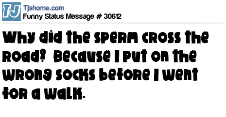 - # 162736 Why did the semen cross the road ? Cause I wore the wrong socks today ...