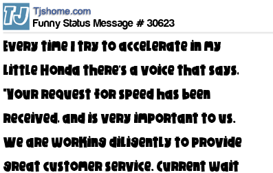 X Every time I try to accelerate in my little Honda there's a voice that says, "Your request for speed has been received, and is very important to us. We are working diligently to provide great customer service. Current wait time is...five...minutes."