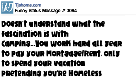 X doesn't understand what the fascination is with Camping...You work hard all year to pay your Mortgage/Rent, only to spend your vacation pretending you're Homeless