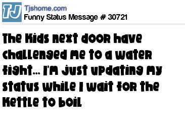 - # 89493 The kids next door have challenged me to a water fight.. I'm just updating my status while I wait for the kettle to boil.