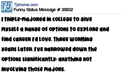 X  I triple-majored in college to give myself a range of options to explore and find career I'd love. Three working years later, I've narrowed down the options significantly: anything not involving those majors.