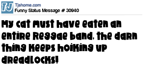 X says My cat must have eaten an entire Reggae band, the darn thing keeps hoiking up dreadlocks!