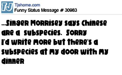 X says ...Singer Morrisey says Chinese are a “subspecies.” Sorry I'd write more but there's a subspecies at my door with my dinner