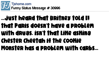 X ...just heard that Britney told E! that Paris doesn't have a problem with drugs. isn't that like asking Chester Cheetah if the Cookie Monster has a problem with carbs...