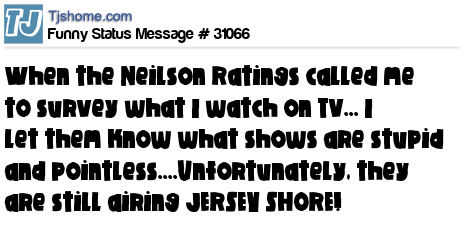 X says when the Neilson Ratings called me to survey what I watch on TV... I let them know what shows are stupid and pointless....Unfortunately, they are still airing JERSEY SHORE!