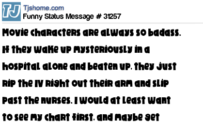 X Movie characters are always so badass. If they wake up mysteriously in a hospital alone and beaten up, they just rip the IV right out their arm and slip past the nurses. I would at least want to see my chart first, and maybe get some juice.