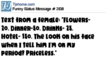 - # 3224 text from a female: "Flowers- 20. Dinner-50. Drinks- 25. Hotel- 150. The look on his face when I tell him I'm on my period? Priceless."