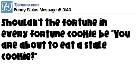 - # 26785 pretty sure that if fortune telling was real every fortune in every fortune cookie would read "You are about to eat a stale cookie, boo-yah!"