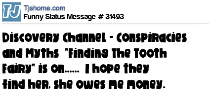 - # 125715 Discovery Channel - Conspiracies and Myths "Finding The Tooth Fairy" is on...... I hope they find her, that biotch still owes me money from when I was 6.