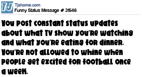 X You post constant status updates about what TV show you're watching and what you're eating for dinner. You're not allowed to whine when people get excited for football once a week.