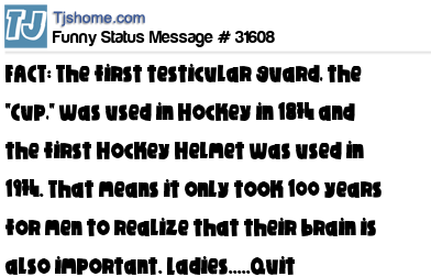 - # 183109 Amazing fact #362: The first testicular guard, the "Cup," was used in Hockey in 1874 and the NHL first started requiring helmets in 1974. That means it only took 100 years for men to realize that their brain is also important.