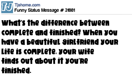 X What's the difference between complete and finished? When you have a beautiful girlfriend your life is complete, your wife finds out about it you're finished.