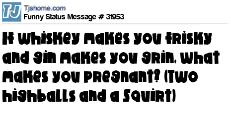 X says If whiskey makes you frisky and gin makes you grin, what makes you pregnant? (Two highballs and a Squirt)