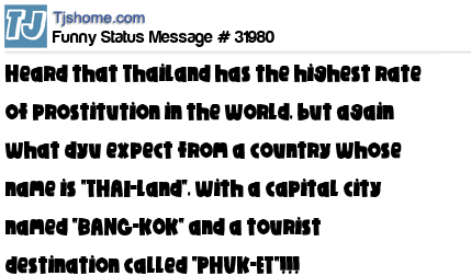 X  heard that Thailand has the highest rate of prostitution in the world, but again what dyu expect from a country whose name is "THAI-land", with a capital city named "BANG-KOK" and a tourist destination called "PHUK-ET"!!!