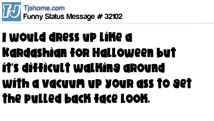 X is I would dress up like a Kardashian for Halloween but it's difficult walking around with a vacuum up your ass to get the pulled back face look.