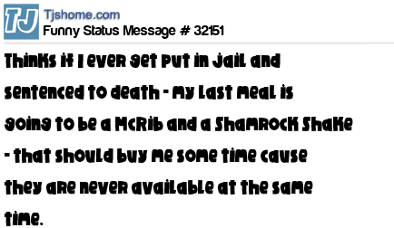 - # 32152 thinks if I ever get put in jail and sentenced to death - my last meal is going to be a McRib and a Shamrock Shake - that should buy me some time cause they are never available at the same time.