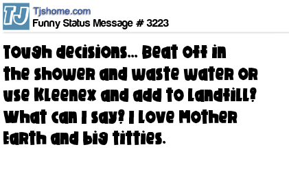 - # 3137 Tough decisions... Beat off in the shower and waste water or use Kleenex and add to landfill? What can I say? I love Mother Earth and big titties