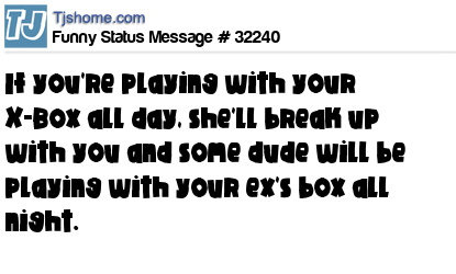 - # 83336 Fellas: If you're playing with your X-Box all day, she'll break up with you and some dude will be playing with your ex's box all night.