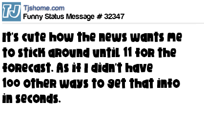 X It's cute how the news wants me to stick around until 11 for the forecast. As if I didn't have 100 other ways to get that info in seconds.
