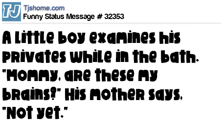 X A little boy examines his privates while in the bath. "Mommy, are these my brains?" His mother says, "Not yet."