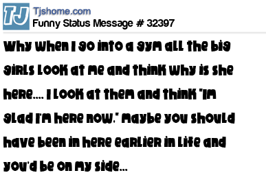 X is Why when I go into a gym all the big girls look at me and think why is she here.... I look at them and think "Im glad I'm here now," maybe you should have been in here earlier in life and you'd be on my side...