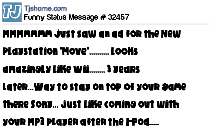 X MMMmmmm just saw an ad for the New Playstation "Move".......... looks amazingly like Wii........ 3 years later...Way to stay on top of your game there Sony... just like coming out with your MP3 player after the I-Pod.....