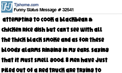 X is attempting to cook a blackbean & chicken rice dish but can't see with all the thick black smoke and as for these bloody alarms ringing in my ears, saying that it must smell good, 8 men have just piled out of a red truck are trying to break down my door