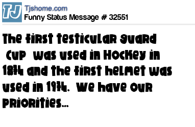 X The first testicular guard “Cup” was used in Hockey in 1874 and the first helmet was used in 1974. We have our priorities…