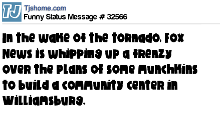 X is In the wake of the tornado, Fox News is whipping up a frenzy over the plans of some munchkins to build a community center in Williamsburg.