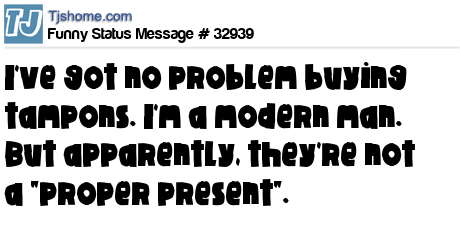 - # 8027 no problems with buying tampons. I am a fairly modern man. But apparently they're not a "proper" present. "Happy birthday, mum!"