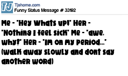 X is Me - "Hey Whats up!" Her - "Nothing I feel sick" Me - "awe, why?" Her - "Im on my period..." (walk away slowly and dont say another word)