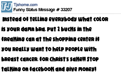 - # 12237 Instead of telling everybody what color is your damn bra, put 2 bucks in the freaking can at the shopping center if you really want to help people with breast cancer, for Christ's sake!! Stop talking on facebook and give money!