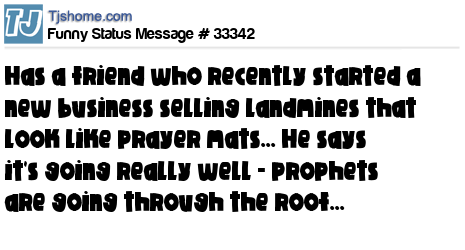- # 141024 My friend has just started his own business manufacturing landmines that look like prayer mats. Apparently, prophets are going through the roof.