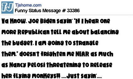 X is Ya know, Joe Biden sayin' "If I hear one more Republican tell me about balancing the budget, I am going to strangle them," doesn't frighten me NEAR as much as Nancy Pelosi threatening to release her flying monkeys!! ....just sayin'....