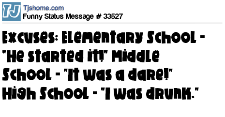 X Excuses: Elementary School - "He started it!" Middle School - "It was a dare!" High School - "I was drunk."