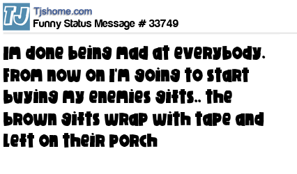 X Im done being mad at everybody. From now on I'm going to start buying my enemies gifts.. the brown gifts wrap with tape and left on their porch