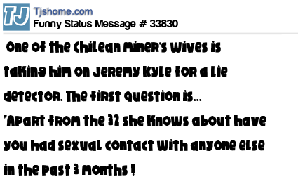 X One of the Chilean miner's wives is taking him on Jeremy Kyle for a lie detector. The first question is... "Apart from the 32 she knows about have you had sexual contact with anyone else in the past 3 months !