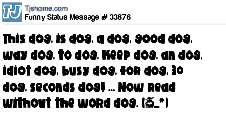 - # 12811 'This dog, is dog, a dog, good dog, way dog, to dog, keep dog, an dog, idiot dog, busy dog, for dog, 30 dog, seconds dog! ... Now read it without the word dog!'