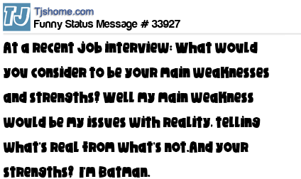 X At a recent job interview: What would you consider to be your main weaknesses and strengths? Well my main weakness would be my issues with reality, telling what's real from what's not.And your strengths? I'm Batman.