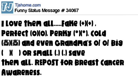 X I love them all.....Fake (+)(+) , Perfect (o)(o), Perky (*)(*), Cold (^)(^) and even Grandma's \o/ \o/ Big ( • )( • ) or small (.) (.) save them all. REPOST for Breast Cancer Awareness.
