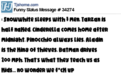 - # 66456 You expect kids to behave when tarzan lives half naked, cinderella comes home midnight, Pinocchio lies all the time, Aladdin is king of thieves, Batman drives at 200mph, sleeping Beauty is lazy & snow white lives with 7 guys?