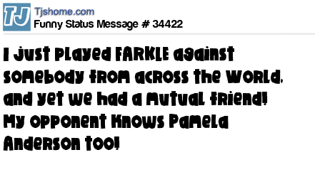 X says I just played FARKLE against somebody from across the World, and yet we had a mutual friend! My opponent knows Pamela Anderson too!